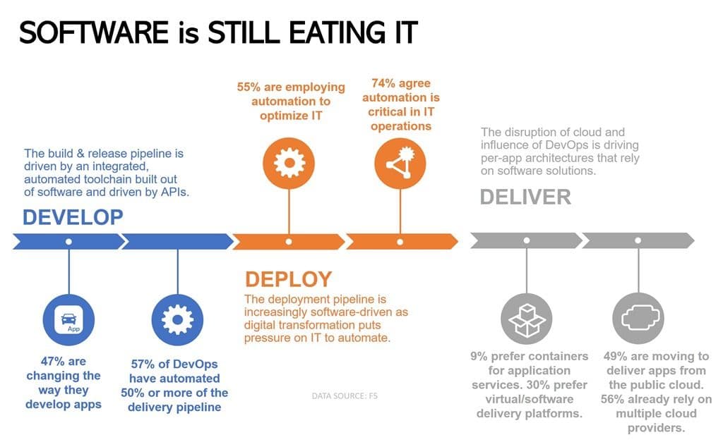 Cloud and DevOps again get a head nod for driving the need for more automation in the deployment segment. This “other side of the production wall” segment is dominated by ops who automate app infrastructure deployment as well as they automate build and test processes. This was never really the problem. The issue was the “rest of the pipeline”. The piece of the pipeline that was comprised of network infrastructure providing the platforms for the application services necessary to scale, secure, and speed up apps.