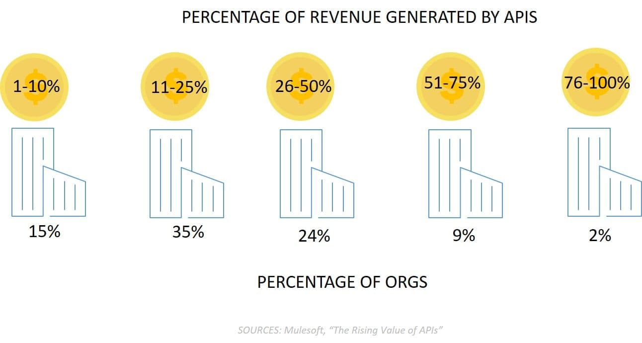 To wit, MuleSoft in its "The Rising Value of APIs" research found that a mere 10% of organizations were deriving 0% of their revenue from APIs. The other 90% are generating varying percentages of revenue from their API efforts, with the bulk doing a brisk business via APIs.