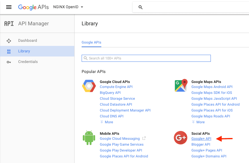 4. Click Google+ API (in the Social APIs section).