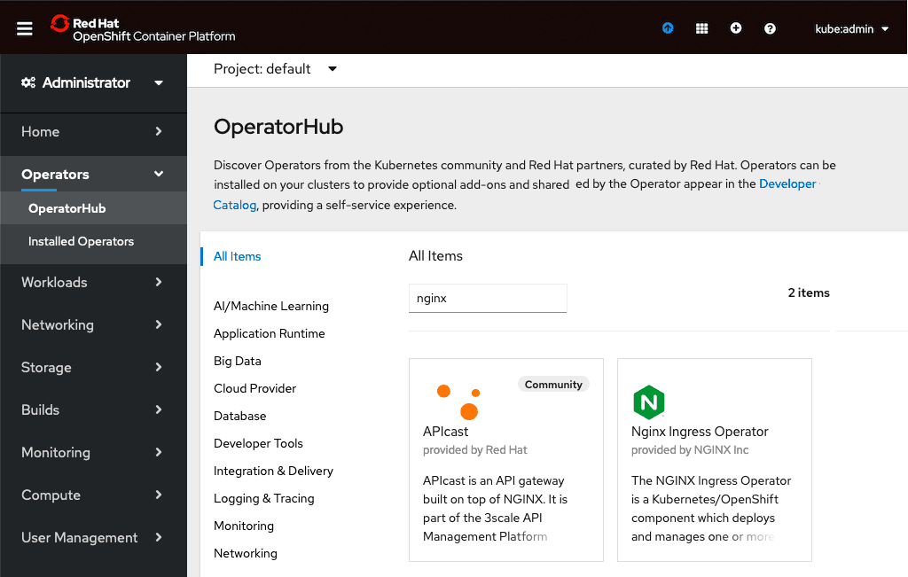 - In the left navigation column, click Operators and then OperatorHub. Type nginx in the search box, and click on the Nginx Ingress Operator box that appears.
