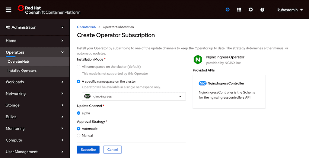 - On the Create Operator Subscription page that opens, specify the cluster namespace in which to install the operator (in this example it’s nginx-ingress). Also click the Automatic radio button under Approval Strategy, to enable automatic updates of the running Operator instance without manual approval from the administrator. Click the Subscribe button.