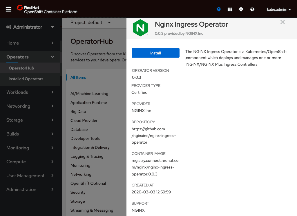 We install the NGINX Ingress Operator from the OpenShift console.