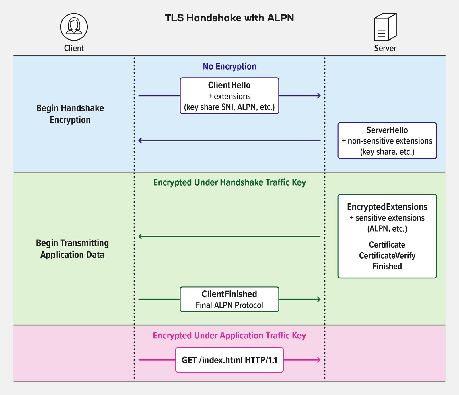 Application‑Layer Protocol Negotiation (ALPN) is an optional extension to the TLS handshake, used by the client and server during the TLS handshake to choose the Layer 7 protocol they will use in the encrypted session established by the handshake. The most common use case for ALPN is to negotiate the upgrade from HTTP/1.x to HTTP/2 for the session between a browser and a web or app server.