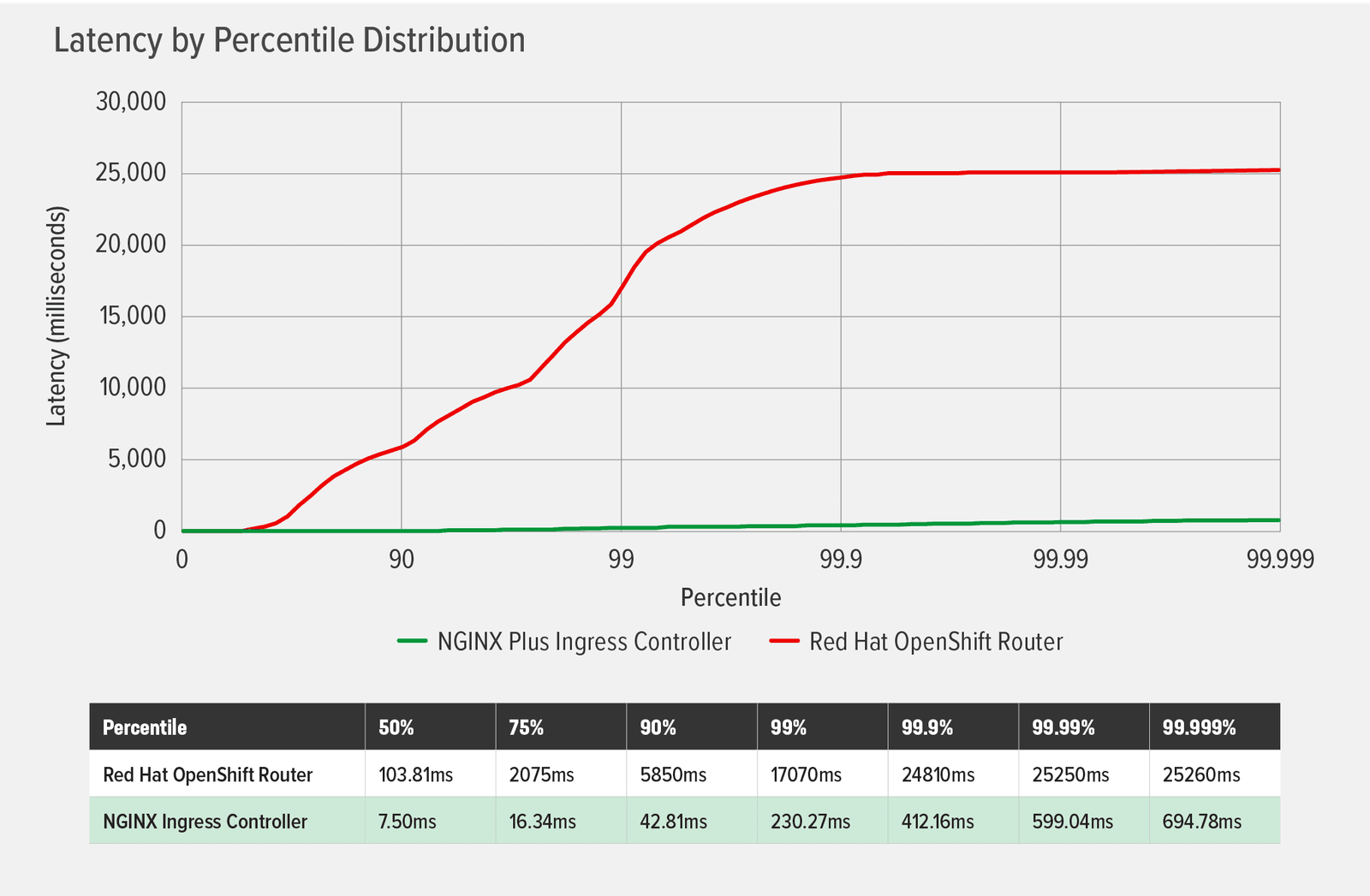 As the following chart illustrates, NGINX Ingress Controller added negligible latency throughout the test, reaching a maximum of less than 700ms at the 99.999th percentile. In contrast, the OCP Router added latency at fairly low percentiles, and latency increased exponentially until it plateaued at a bit more than 25,000ms (25 seconds) at the 99.99th percentile. This demonstrates that, when under load while changes in the cluster environment are applied frequently, the Router can cause a poor user experience.