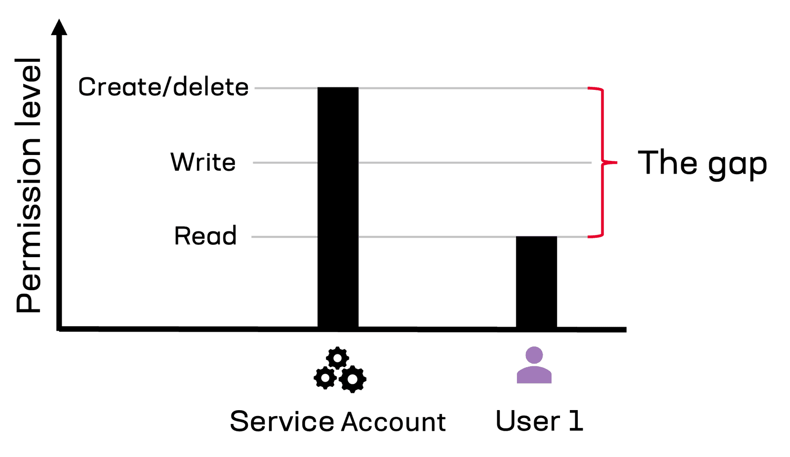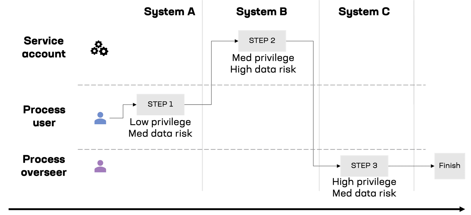 Assigning least-privileged access to various corporate resources is straightforward for users based on their roles, but services, while still constrained, are configured to allow most-privileged access so they can perform all the actions required throughout a process. For example, a user may only have write access to a set of records in a system that corresponds to their assigned customer accounts and read only access to all other customer accounts. Service accounts, on the other hand, need write access to all accounts.