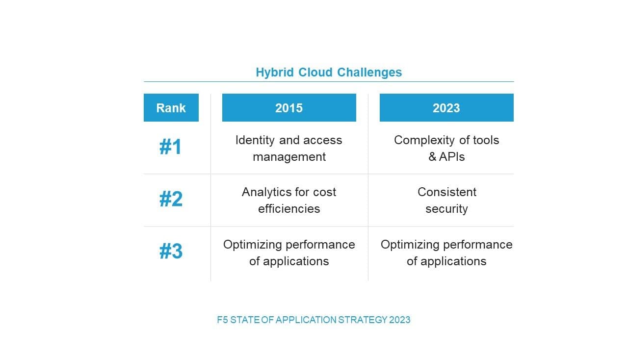The myriad of tools and APIs, each with slightly different features and functionality from different tech and cloud service providers, is placing a massive burden on already time-squeezed IT teams, with a resulting lack of standardization and integration. Consistent security across hybrid locations and app architectures has been a top challenge since 2018 where it steadfastly remains today. Organizations are looking to consistently deploy security across their hybrid estate that meets the many regulatory requirements in which global organizations operate. These top two hybrid challenges support why multi-cloud networking (MCN), which abstracts the connectivity between multiple cloud locations and architectures, was a top trend in 2023.