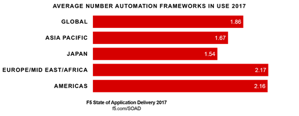 Organizations are adopting frameworks, tools, and technologies that enable automation. Globally, organizations employ an average of 1.86 frameworks to realize the scale and speed necessary to compete in today’s digital economy. And the more apps a business manages the more frameworks it tends to use. The market is already seeing its targets slowly solidify, as some frameworks tend to be more popular with different constituencies within IT. There’s also merges and acquisitions to take into consideration that bring different technologies and architectures into the fold. These factors mean multiple frameworks are often in use. A non-trivial 12% of respondents in our survey indicate they’re currently using four or more frameworks today.