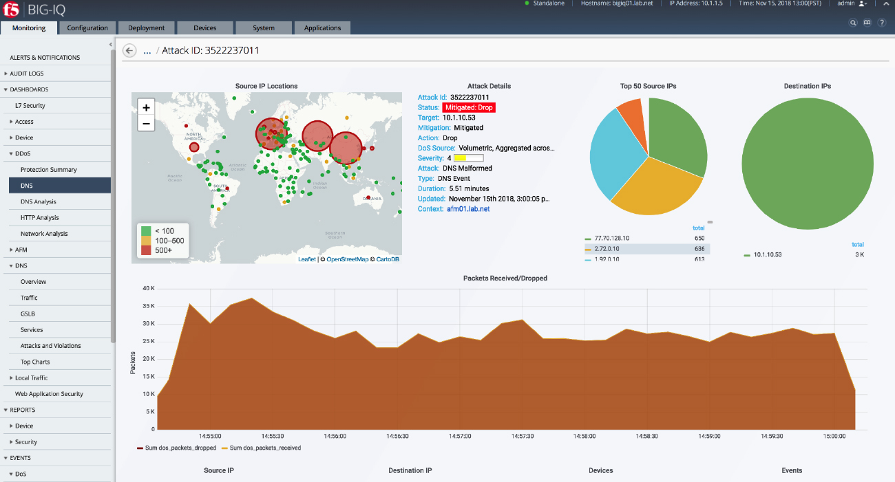 F5 BIG-IQ® 集中管理は、デバイスの健全性を測定し、DDoS 攻撃を調査するために使用されます。 図 1 では、管理されているすべての F5 BIG-IP® 製品で DNS DDoS 攻撃の詳細を確認できます。 攻撃の種類、サイズ、フロー履歴、送信元および宛先 IP アドレス、Geo IP マップ、ステータスが表示されます。 攻撃タイプの詳細には、In/Drop リクエスト (フィルタリングされたトラフィックの量)、ステータス (攻撃が進行中か軽減されたか)、開始/終了時刻 (攻撃のイベント開始日と終了日)、および各 BIG-IP モジュールによって観測されたトラフィックの量が表示されます。