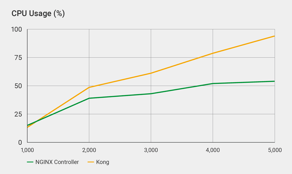 Kong effectively caps out at 5,000 API calls per second – latency spikes noticeably at call volumes any higher than that, indicating the system is fully loaded. At 5,000 calls per second, CPU usage is 93%, 73% higher than the API Management Module.