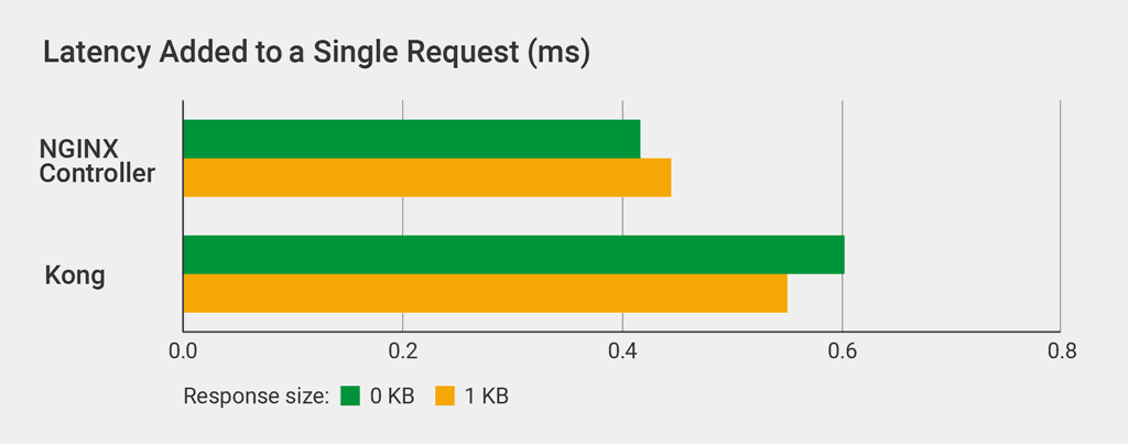 Kong increases latency compared to the API Management Module: by 44% for a 0-KB file and 24% for a 1-KB file.