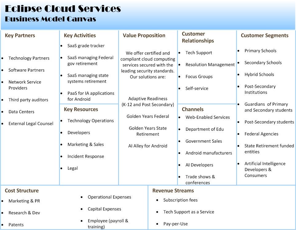 Opportunities for access are conduits that give malicious attackers and unwitting insiders opportunities for compromise. Examples include zero-day exploits of software vulnerabilities, downstream partner breaches, configuration errors, and poor process management. You can identify these conduits by modeling the business using a pace-layering approach; that is, thorough analysis and modeling of your organization’s business model by conducting a series of information modeling activities. The figure below is a representation of a fictitious organization’s business model represented in the Business Model Canvas, an information modeling methodology introduced in the book Business Model Generation.3