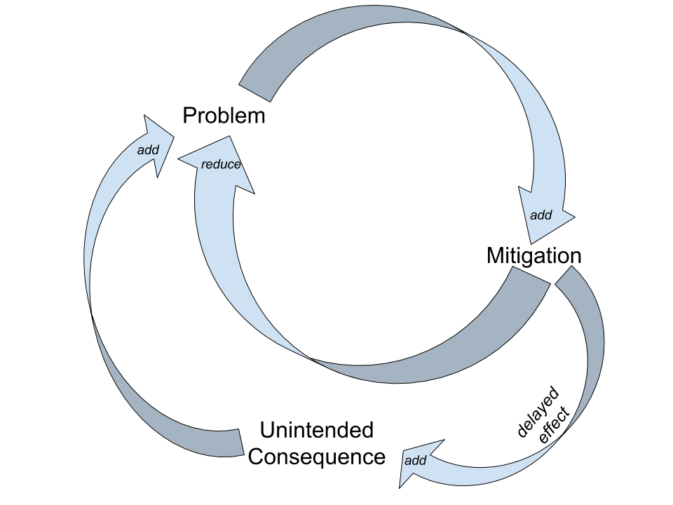In the real world, most IT infrastructures are complex Rube Goldberg machines composed of a tapestry of piecemeal designs and multiple point solutions stitched together over time. On top of that, these IT systems are also interwoven with dynamic “out of scope” processes such as legal, business, social, and financial subsystems. Many of these variables and subsystems can affect each other with delayed and non-direct feedback loops. How can there ever be “one little change” to such a complex system without unforeseen effects? Small events that are separated by distance and time can cause significant upheaval in complex systems. Worse, as problems mount, the use of the same poorly fitting fix over time can create more and more unintended consequences that silently build up to a major new problem.