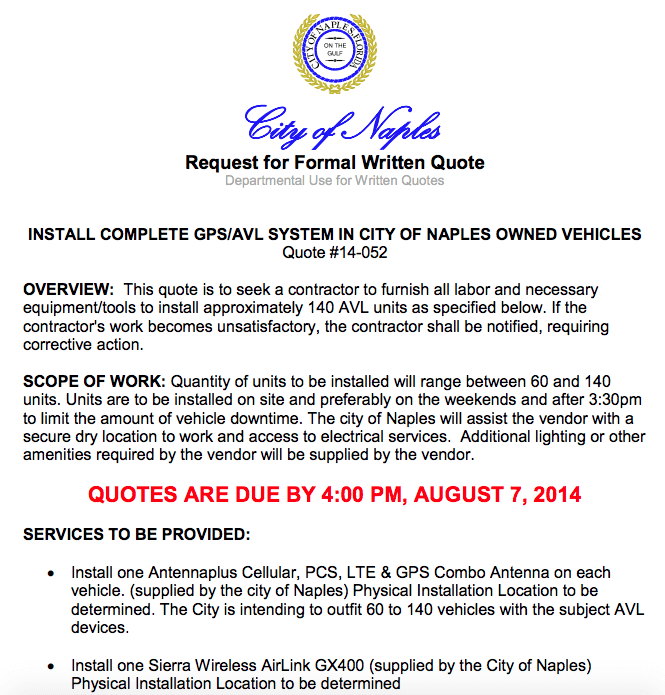 Another interesting example is the City of Naples, Florida. Here, we came across a request for bids regarding the installation of 140 AVL (Automatic Vehicle Locator) units, including a Sierra Wireless AirLink GX400.2