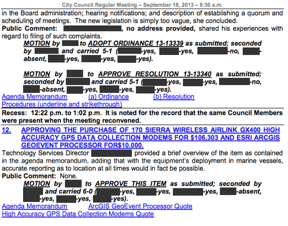 We can even go watch the September 18, 2013 Naples City Council meeting where the Technology Services Director provides his brief overview of the items being purchased.5 During the meeting, he discloses that they tested the systems on police and fire vehicles over the summer and feel comfortable deploying them on all 200 vehicles, including marine. They further disclose they only plan to keep GPS records for their fleet for a max of one week, pointing to the challenges of storing large amounts of data since they collect GPS data every 5 seconds. Through these documents, we also learn which software they will be using to log their GPS data: ESRI ArcGIS GeoEvent Processor.6