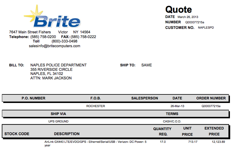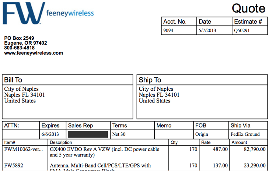 Figure 4: Price quote for City of Naples purchase of Sierra Wireless Airlink GX440