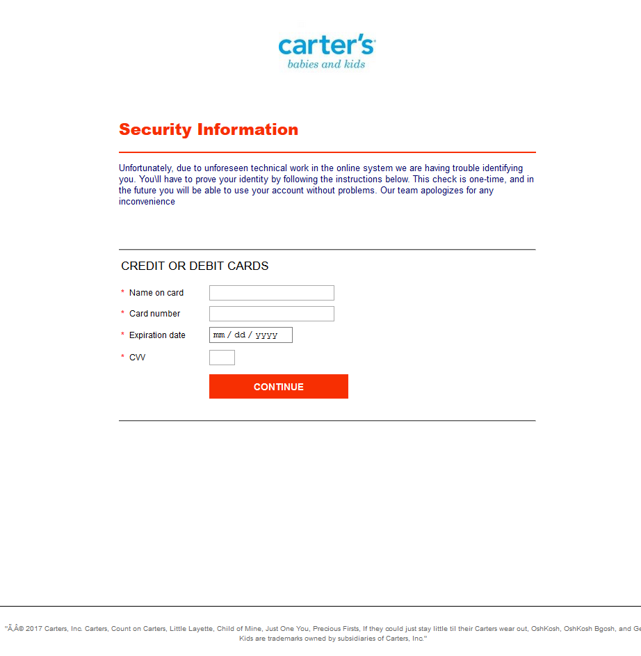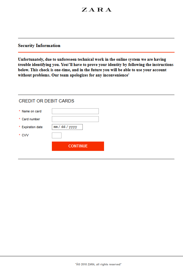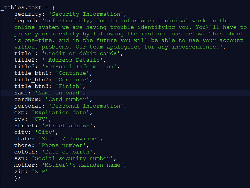 In the eCommerce scenario, Ramnit is still reliant on social engineering to create a scenario in which the user is asked to provide additional information. At the third stage, an infected user on an eCommerce site is presented the same “technical issue” message, stating they require a “one-time check” of information that won’t be required again… but the data they request is slightly different: