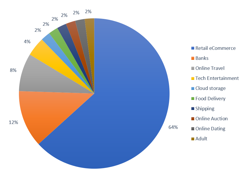 - 64% of its targets were retail eCommerce sites, including Amazon.com, Best Buy, Forever 21, Gap, Zara, Carter’s, OshKosh B’gosh, Macy’s, Victoria’s Secret, H&M, Overstock.com, Toys“R”Us, Zappos, and many others.