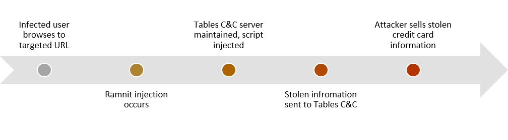 Ramnit maintains its injection and stolen information on a Command & Control (C&C) server called Tables. Tables injects script based on the user browsing action. When the infected user accesses a targeted URL, Ramnit triggers a maintained external script to the requested page and sends back the stolen information to the Tables C&C server.