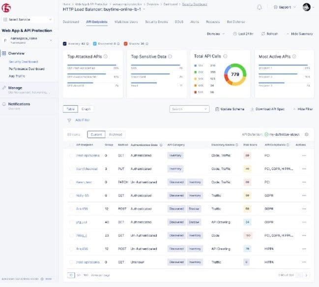 Figure 1: F5 Distributed Cloud API Security lets users view and understand details for every API, including authentication information, sensitive data and compliance status, category, and risk score—while seamlessly creating API and data protection rules.