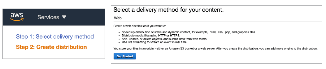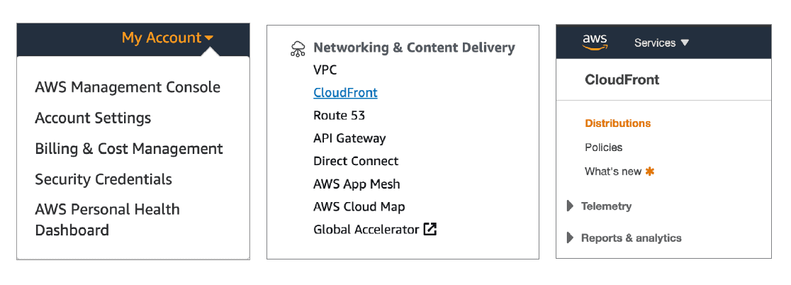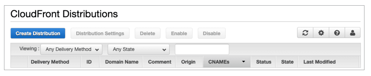 Once these components are in place and provisioned, customers can initiate the CloudFront configuration by navigating to the AWS management console. In the console menu, locate and select the sub-category "Networking & Content Delivery" / CloudFront. Locate and select the "Distributions" link and proceed to create the initial distribution.