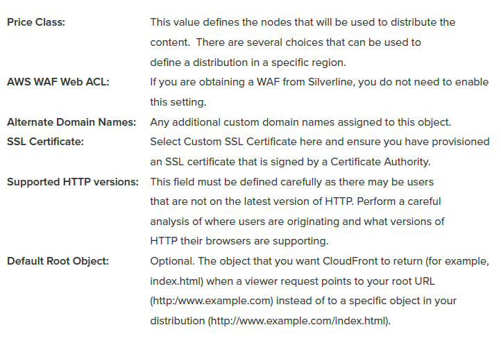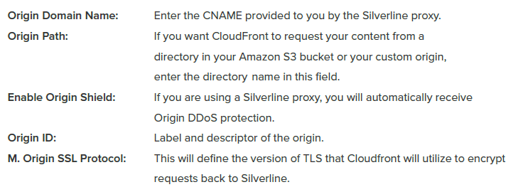 Origin Customer Headers: Custom header keys and values will be in every request to origin. These settings may also be used to filter out any requests at the Silverline proxy that are not originating from CloudFront.
