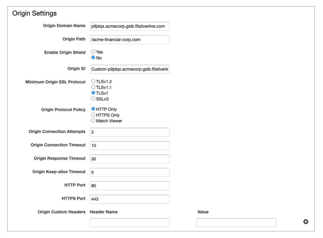 Origin Connection Attempts, Origin Timeout, Origin Response Timeout, Origin Keep-Alive Timeout, HTTP and HTTPS Ports should remain as defaults unless a change is required.