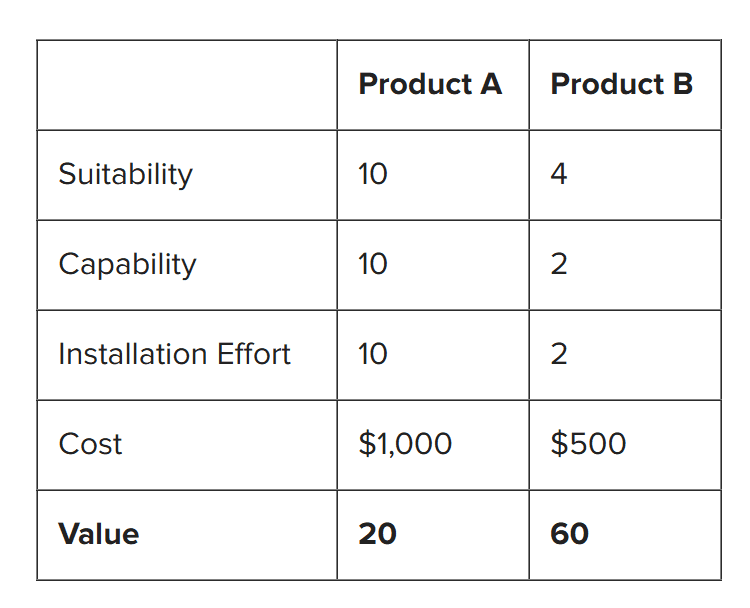 In comparison, Product B has nowhere near the capabilities of its rival, albeit still providing acceptable levels of monitoring and security. However, it scores over the competing product when it comes to both cost and ease of installation. Tabulating the scores for each product produces the table below, with marks awarded from 1 to 10 for suitability, capability, and installation effort, with 1 as the lowest and 10 as the highest.