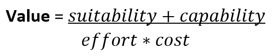 When looking to implement a technology such as containerization, you need some way of measuring the value that this new approach brings. The factors that affect value would typically include suitability, capability, effort, and cost. The following equation gives an example of how to assign relative value based on those factors.