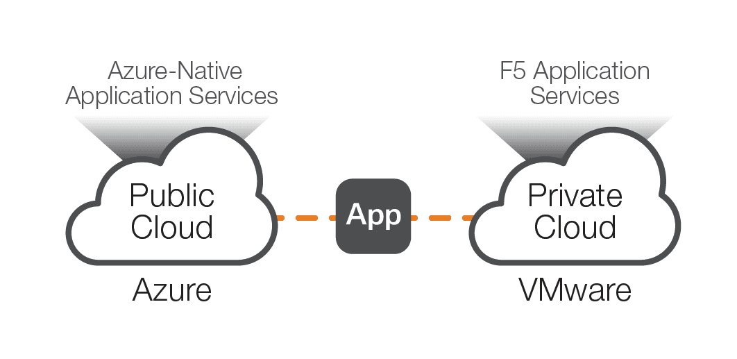 Our first example is a hybrid-cloud environment using Azure with Azure-native application services for the public cloud aspect, while leveraging VMware with F5 application services for the private cloud component, as shown in figure 1.
