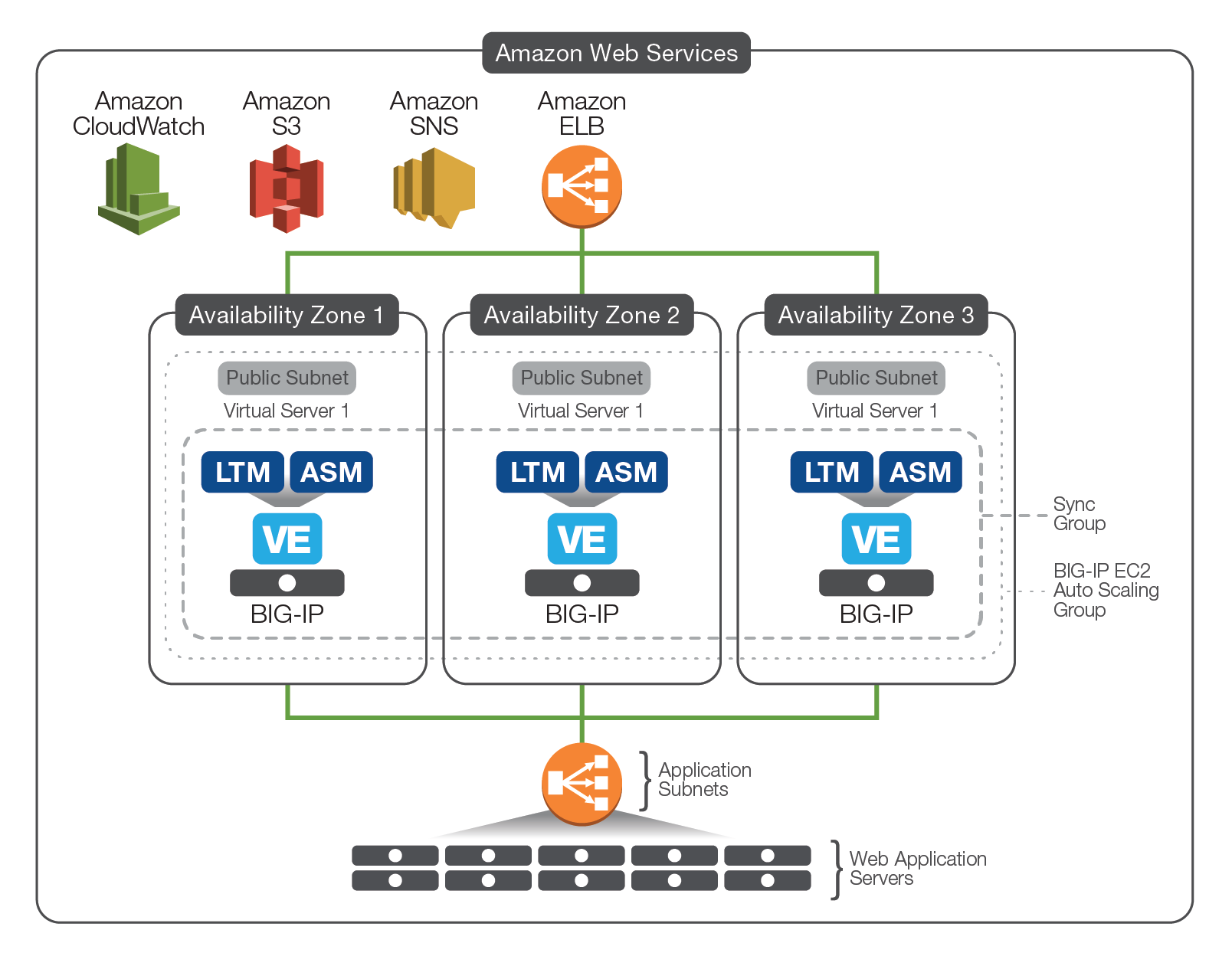 A key benefit in moving application workloads to public cloud platforms is the ability to scale an application beyond provisioned base capacity in the data center. With AWS Auto Scaling, applications maintain availability while automatically scaling Amazon EC2 capacity up or down according to pre-defined thresholds. BIG-IP solutions integrate with AWS Auto Scaling to enable dynamically scaled BIG-IP application and security services. And because BIG-IP VEs natively handle the addition or removal of pool members, there is no need for out-of-band orchestration and configuration management. In addition to the auto scaling of the BIG-IP LTM (see Figure 1.), F5 has released solutions that enable auto scaled application security, whereby both BIG-IP LTM and BIG-IP ASM are provisioned on the BIG-IP VE.
