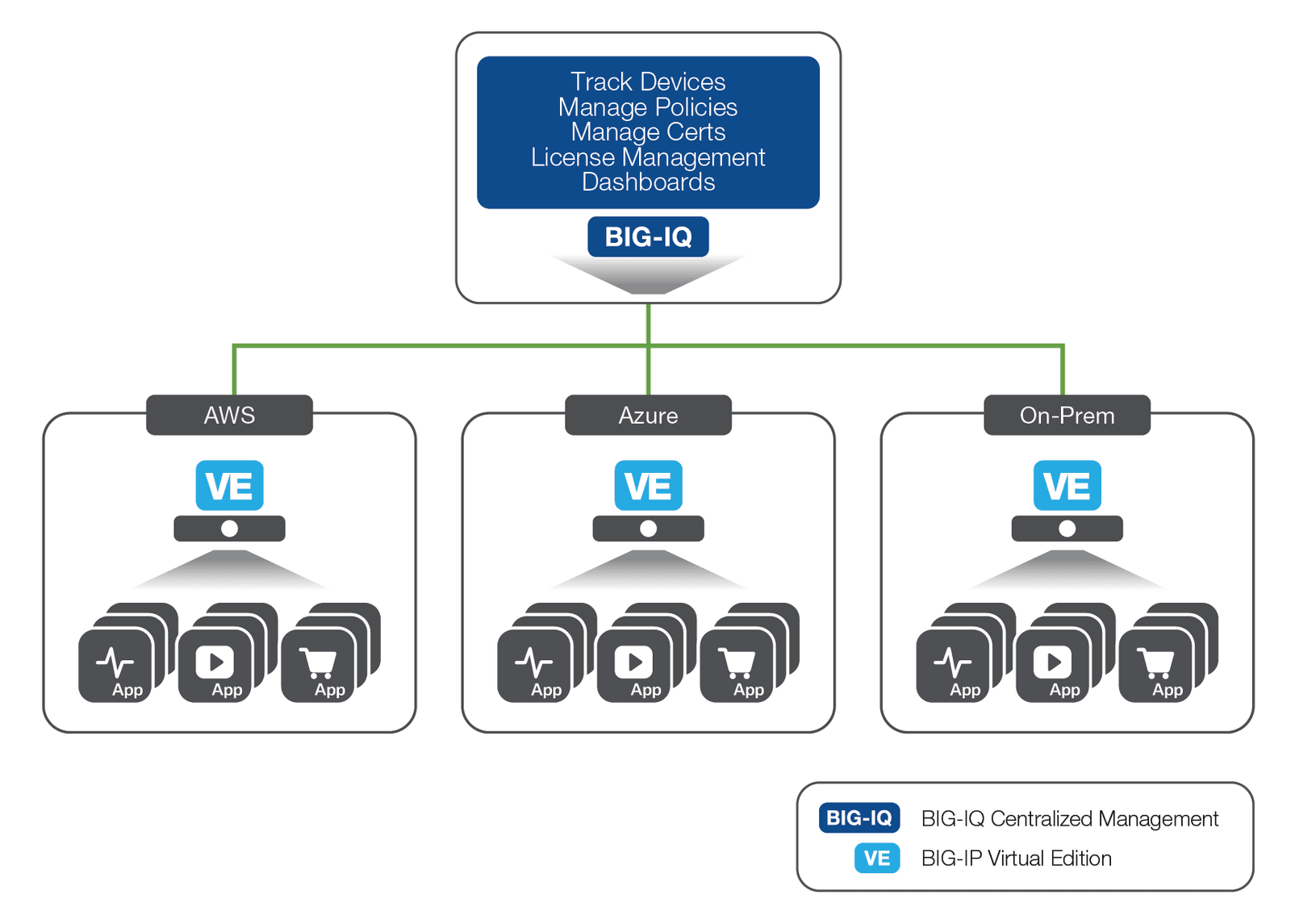 F5® BIG-IQ® Centralized Management provides a central point of control for F5 physical and virtual devices both in the cloud and on-prem. BIG-IQ Centralized Management simplifies application management, helps ensure compliance, and provides tools to manage F5 devices and services consistently and securely, wherever they reside. BIG-IQ Centralized Management handles policies, licenses, SSL certificates, images, and configurations for F5 devices and for the following F5 modules: