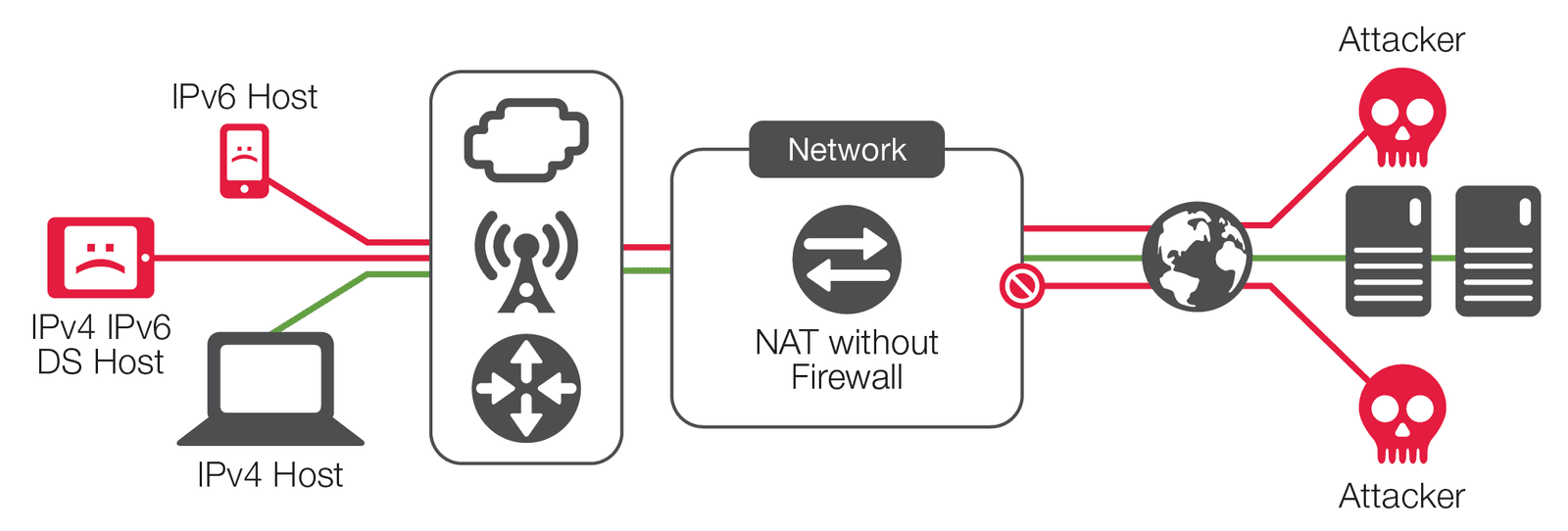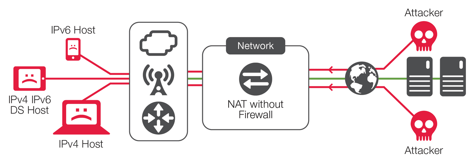 Further, many service provider networks are now providing IPv4/IPv6 dual-stack configurations. In this case, even if the service provider has NAT44 enabled, the IPv6 interface does not, meaning that the organization has decided that NAT suffices for security on the IPv4 interfaces, but the same host remains completely open on the IPv6 interface—which is logically incongruent. Why would a network architect believe that protection is required in IPv4 and not IPv6 when the exact same threats apply to both?