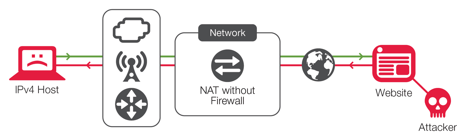 Stateful ingress IPv4 traffic is the only traffic type where anyone could reasonably argue that security protection is provided by NAT, and then only under certain conditions. This is a myth that persists, but as the above explanations make clear, that IPv4 traffic is only a fraction of the attack surface presented by networked hosts. Furthermore, stateful NAT does not provide much protection even for IPv4 ingress, given that modern attack techniques assume there will be a NAT device in the path, one that must be subverted. Static and destination translation of hosts provides no security.