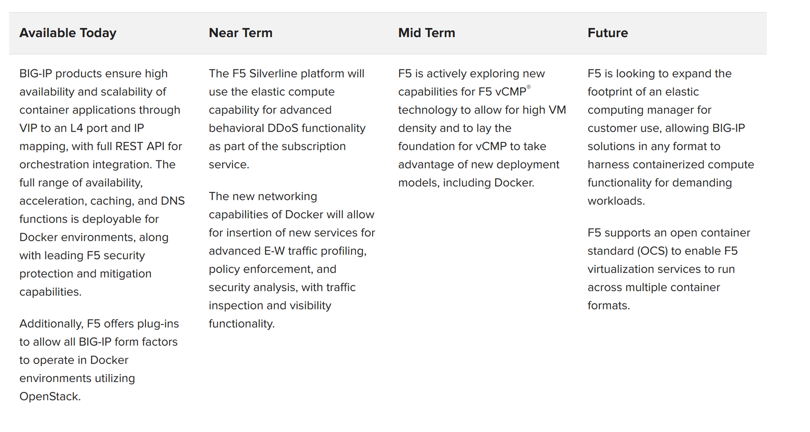 F5 plans to extend these services into the containerized infrastructure itself to address service discovery, E-W traffic management, and security. F5 also plans to leverage containerization within its product suite, taking advantage of the technology on physical platforms, offering software services in containers, and using the containerized architecture within the F5 Silverline® cloud-base services platform.