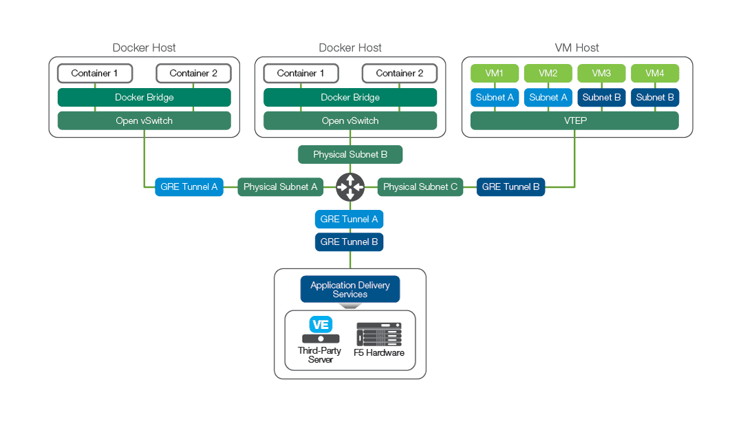 Scaling applications in this type of environment requires ADC services that can also participate natively in the tunneling protocols. F5 offers multi-tenant VXLAN and GRE capabilities so that functions such as load balancing, SSL offload, firewalling, application security, NAT, and DNS services can be served to clients on the network through a tunnel. Furthermore, F5 provides interoperability between tunnel encapsulation types, including 802.1Q VLANs.