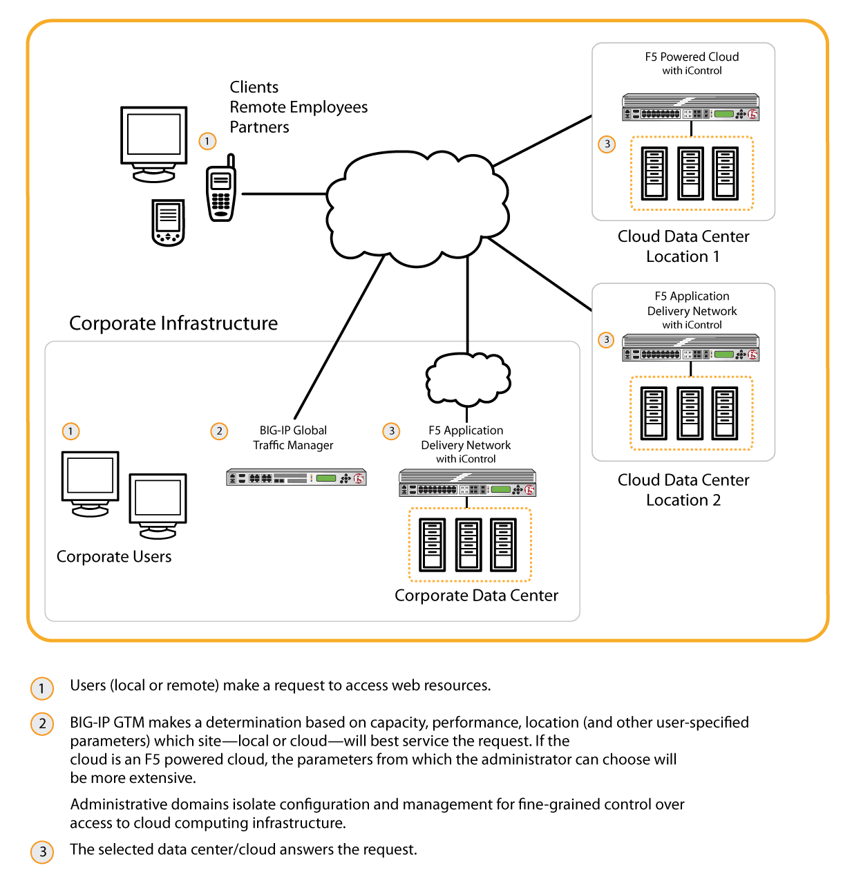 Like business, the cloud is dynamic in nature; as such, cloud computing integration and support needs to be flexible. F5® solutions, in general, focus on the task of application delivery. Since the driver for any cloud deployment, regardless of model or location, is to deliver applications in the most efficient, agile, and secure way possible, all F5 solutions can fit within the cloud infrastructure and enhance application delivery. The dynamic control plane of cloud architecture requires the capability to intercept, interpret, and instruct where the data must go and must have the necessary infrastructure, at strategic points of control, to enable quick, intelligent decisions and ensure consistent availability.
