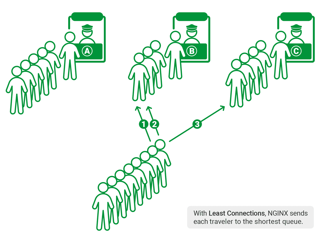 There’s a much better approach. The guide watches each queue, and each time a traveler arrives, he sends that traveler to the shortest queue. This method is analogous to the Least Connections load‑balancing method in NGINX, which assigns each new request to the server with the fewest outstanding (queued) requests: