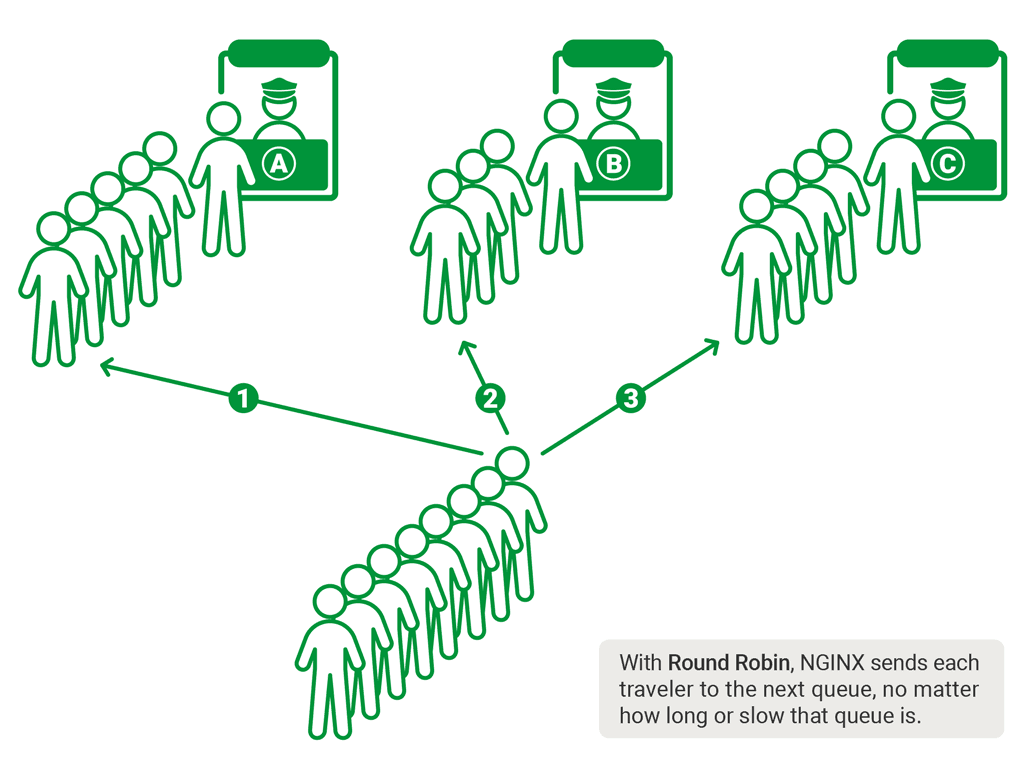 Round robin is a naive approach to load balancing. In this approach, the guide selects each queue in rotation – the first traveler is directed to queue A, next traveler to queue B, and so on. Once a traveler is directed to the last queue, the process repeats from queue A. Round Robin is the default load‑balancing algorithm used by NGINX:
