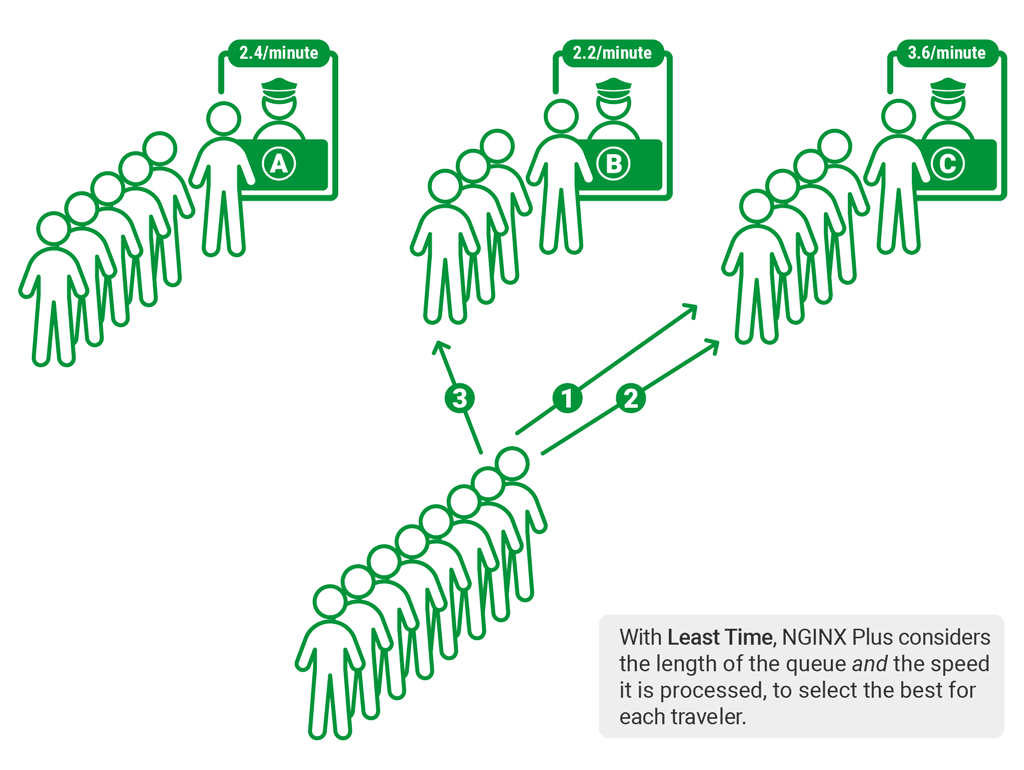 What if each immigration booth has a counter above it, indicating how many travelers have been processed in, for example, the last 10 minutes? Then the guide can direct travelers to a queue based on its length and how quickly it is being processed. That’s a more effective way to distribute load, and it’s what the Least Time load‑balancing algorithm in NGINX Plus does: