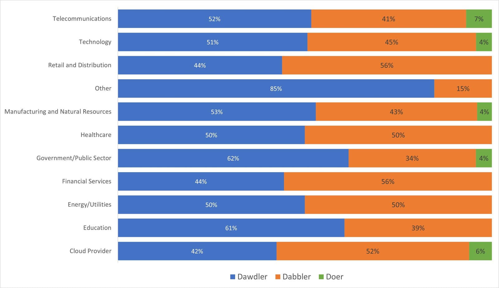 That’s why it’s no surprise that when we look at the maturity of organizations through the lens of industries, we find that no financial services organization is operating at the highest level of maturity. Cloud providers, telecom, and technology firms dominate that category. With the exception of telecom, cloud providers and technology firms are relatively adolescent industries with very little technical and architectural debt than their more-traditional counterparts. That makes it a lot easier for them to push forward faster.