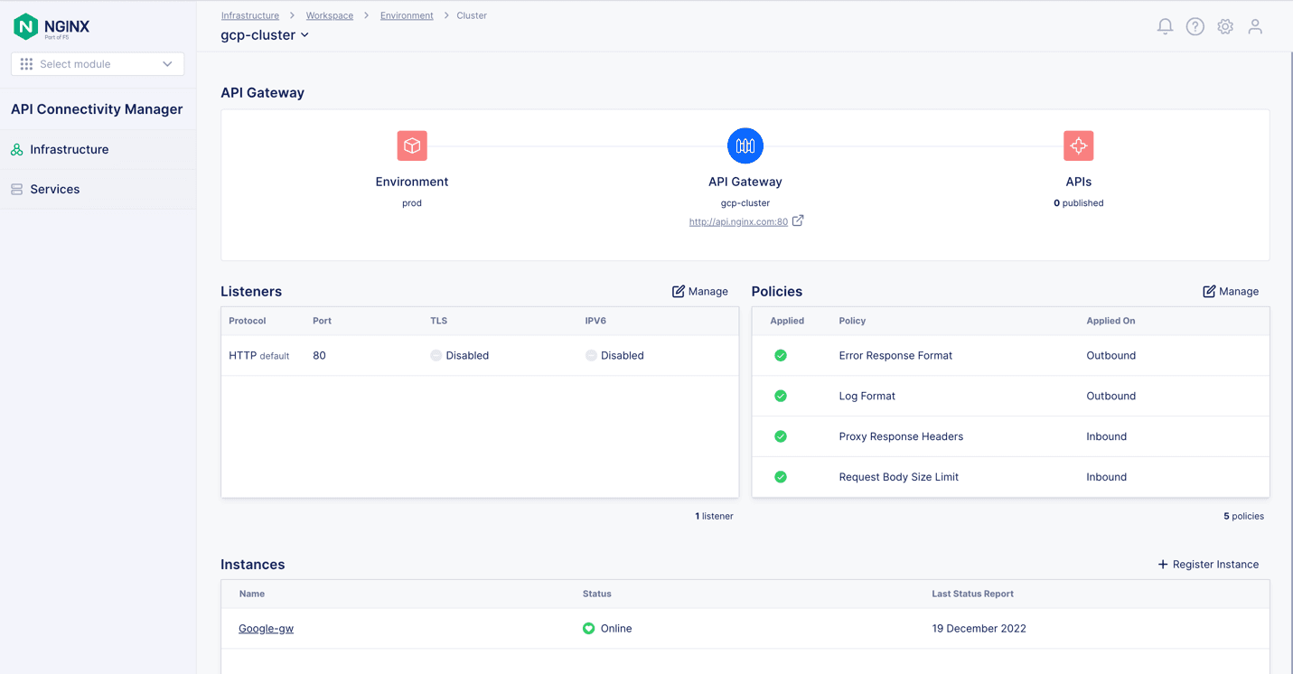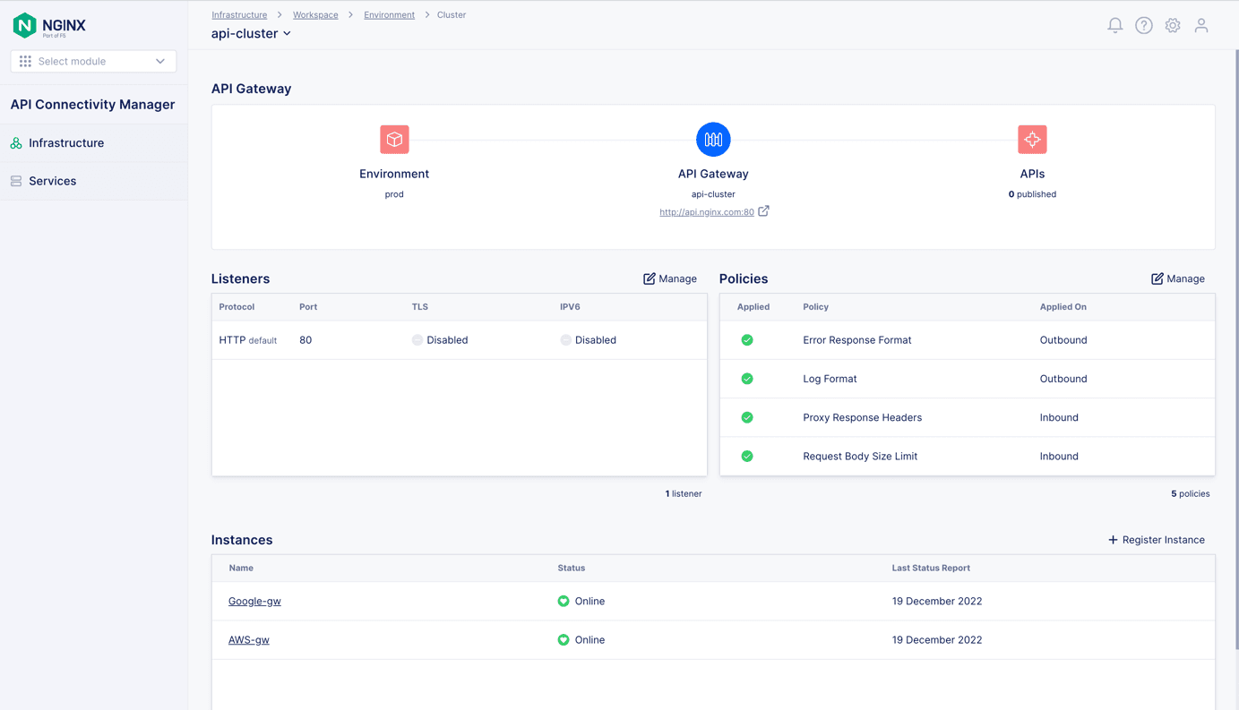 Figure 15: The second of two API Gateway Clusters in an Environment that spans multiple clouds Apply Global Policies Now you can add global policies which apply to all the NGINX Plus instances in an API Gateway Cluster. For example, to secure client access to your APIs you can apply the OpenID Connect Relying Party or TLS Inbound policy. To secure the connection between an API gateway and the backend service which exposes the API, apply the TLS Backend policy. For more information about TLS policies, see the API Connectivity Manager documentation. Conclusion Managing multi‑cloud and hybrid architectures is no easy task. They are complex environments with fast‑changing applications that are often difficult to observe and secure. With the right tools, however, you can avoid vendor lock‑in while retaining the agility and flexibility you need for delivering new capabilities to market faster. As a cloud‑native tool, API Connectivity Manager from NGINX gives you the scalability, visibility, governance, and security you need to manage APIs in multi‑cloud and hybrid environment. Start a 30‑day free trial of NGINX Management Suite, which includes access to API Connectivity Manager, NGINX Plus as an API gateway, and NGINX App Protect to secure your APIs.