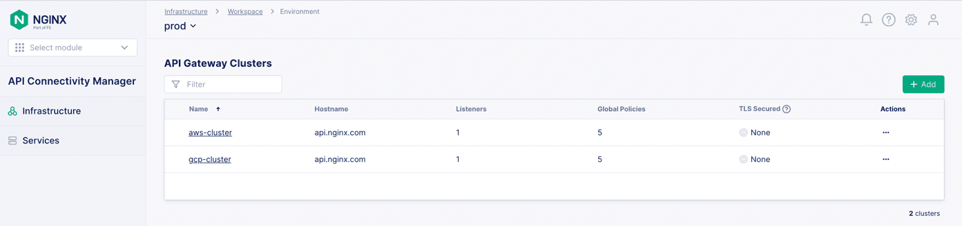 In Deploy NGINX Plus Instances as API Gateways, we deployed two NGINX Plus instances – one in AWS and the other in GCP. The tutorial uses the same instances to illustrate both Environment types (with a single API Gateway Cluster or with multiple API Gateway Clusters); if you want to deploy both Environment types in a single Workspace you would need to create additional NGINX Plus instances for the second Environment.