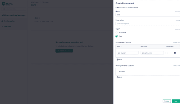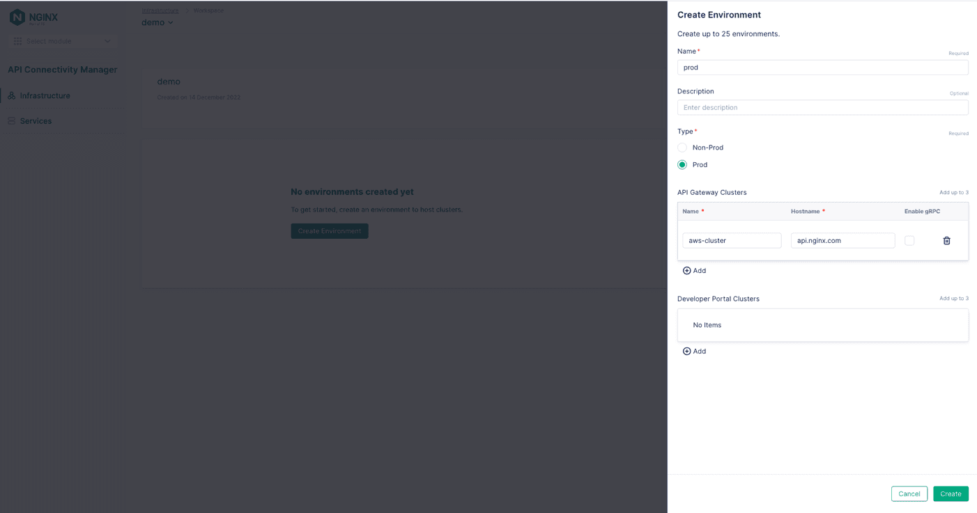 - In the Create Environment panel that opens, fill in the Name field (prod in Figure 6) and optionally the Description field, and select the Environment type (here we’re choosing Prod). Figure 6: Naming a new Environment and assigning an API Gateway Cluster to it