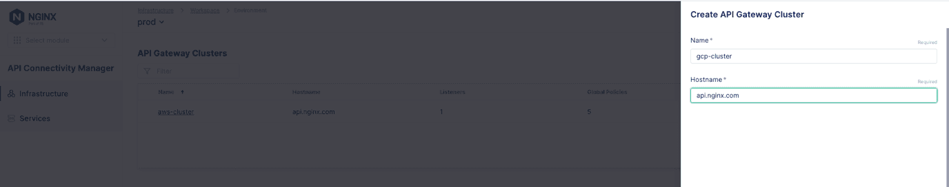 - On the Create API Gateway Cluster panel, fill in the Name field with the second cluster name (gcp-cluster in Figure 12) and the Hostname field with the same hostname as for the first cluster (api.nginx.com). Figure 12: Adding the second API Gateway Cluster to an Environment