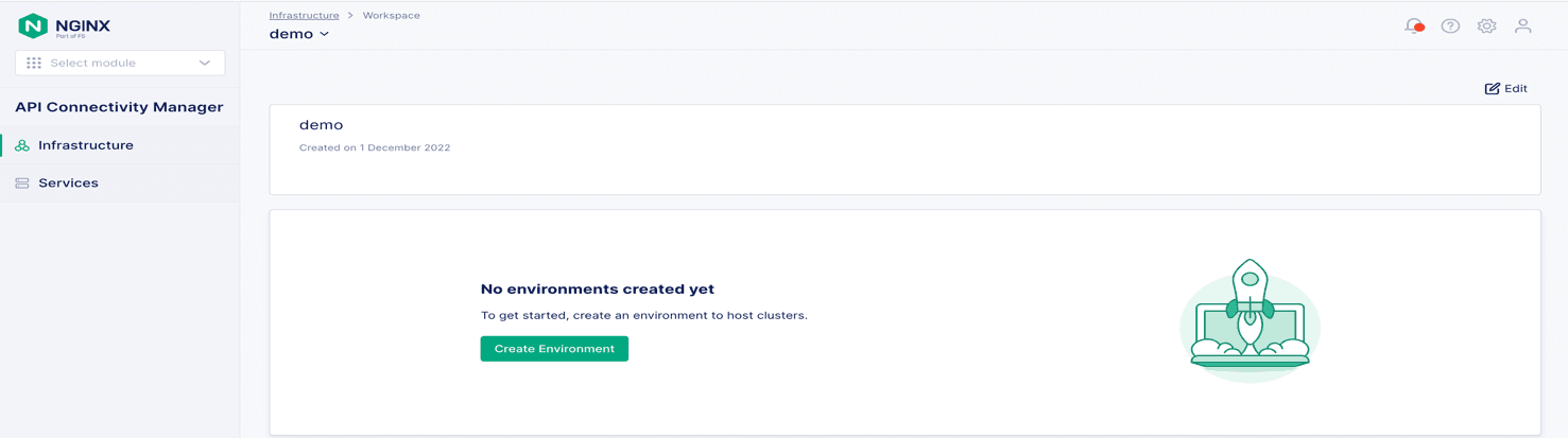 - Navigate to your Workspace and click the Create Environment button, as shown in Figure 9. Figure 9: Creating a new Environment in an Infrastructure Workspace