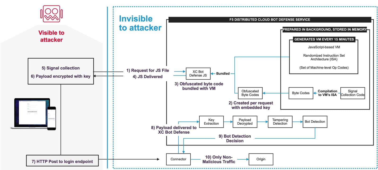 The best defense? Base detection on a variety of advanced network, device, environmental, and behavioral signals using durable and heavily encrypted/obfuscated telemetry that is essentially spoof-proof. F5’s JavaScript leverages bespoke, per-customer implementations, and frequent bytecode randomizations within machine-level opcodes, making it computationally unrealistic to reverse engineer. This technological advantage results in accurate detection and security countermeasures that are resistant to attacker manipulation.