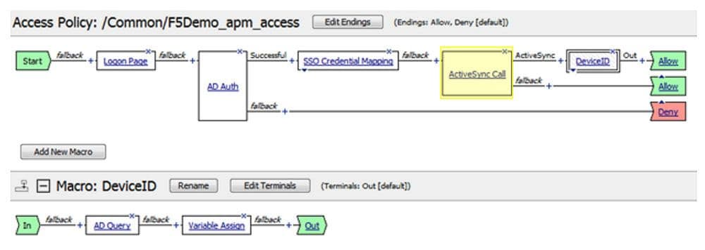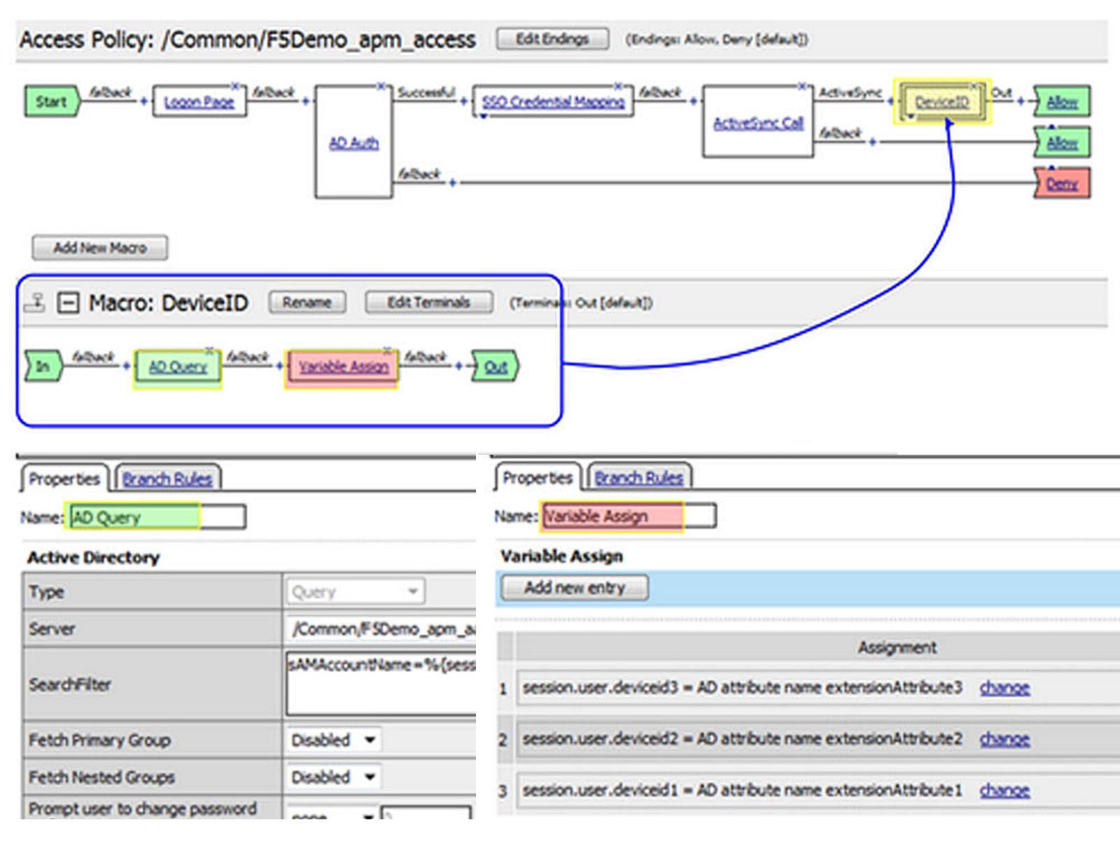 3. If the session is ActiveSync, a macro is utilized that performs an AD Query of the user’s attributes, and captures the Device IDs as session variables.