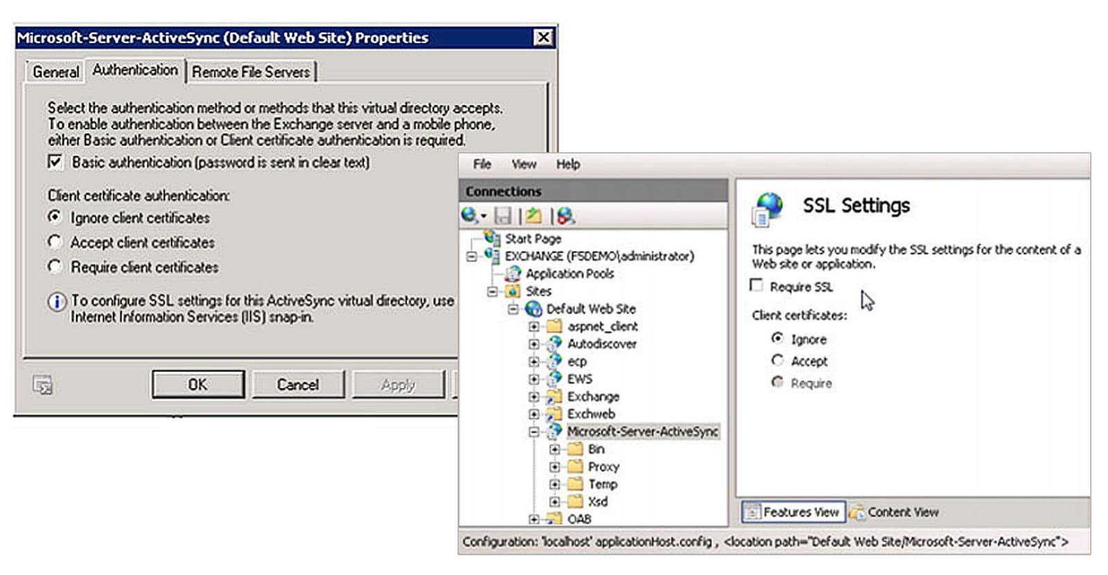 Perhaps one of the most challenging (and therefore seldom used) methods for securing mobile devices is the use of client-side certificates. In the native Exchange implementation, individual certificates must be created, stored in Active Directory, and distributed to devices. In addition, to enable this type of authentication to the CAS array, traffic arriving at the CAS server must be encrypted.