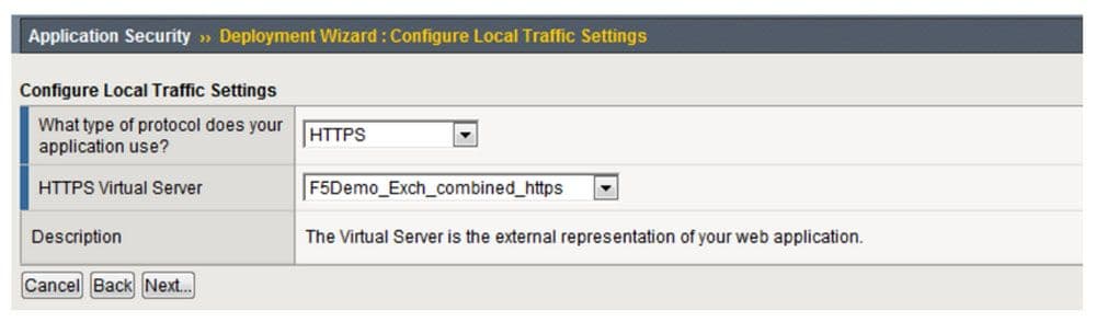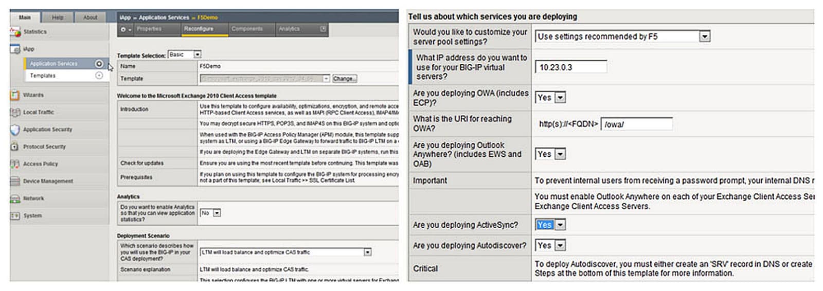 Illustrated below, as a starting point of this guidance, the Exchange environment will be deployed via the Exchange 2010 iApp. Utilizing a menu-drive configuration screen, the base iApp configures access to the Exchange 2010 CAS environment, including access to Exchange ActiveSync.