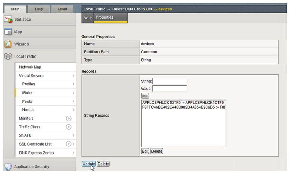 3. An F5 iRule is created and associated with the Exchange HTTPS virtual server. The iRule compares the device ID of the client connection (contained in the HTTP query) with the device IDs stored in the previously created Data Group List. If the device ID is not in the list of acceptable devices, the session is terminated and access is denied.